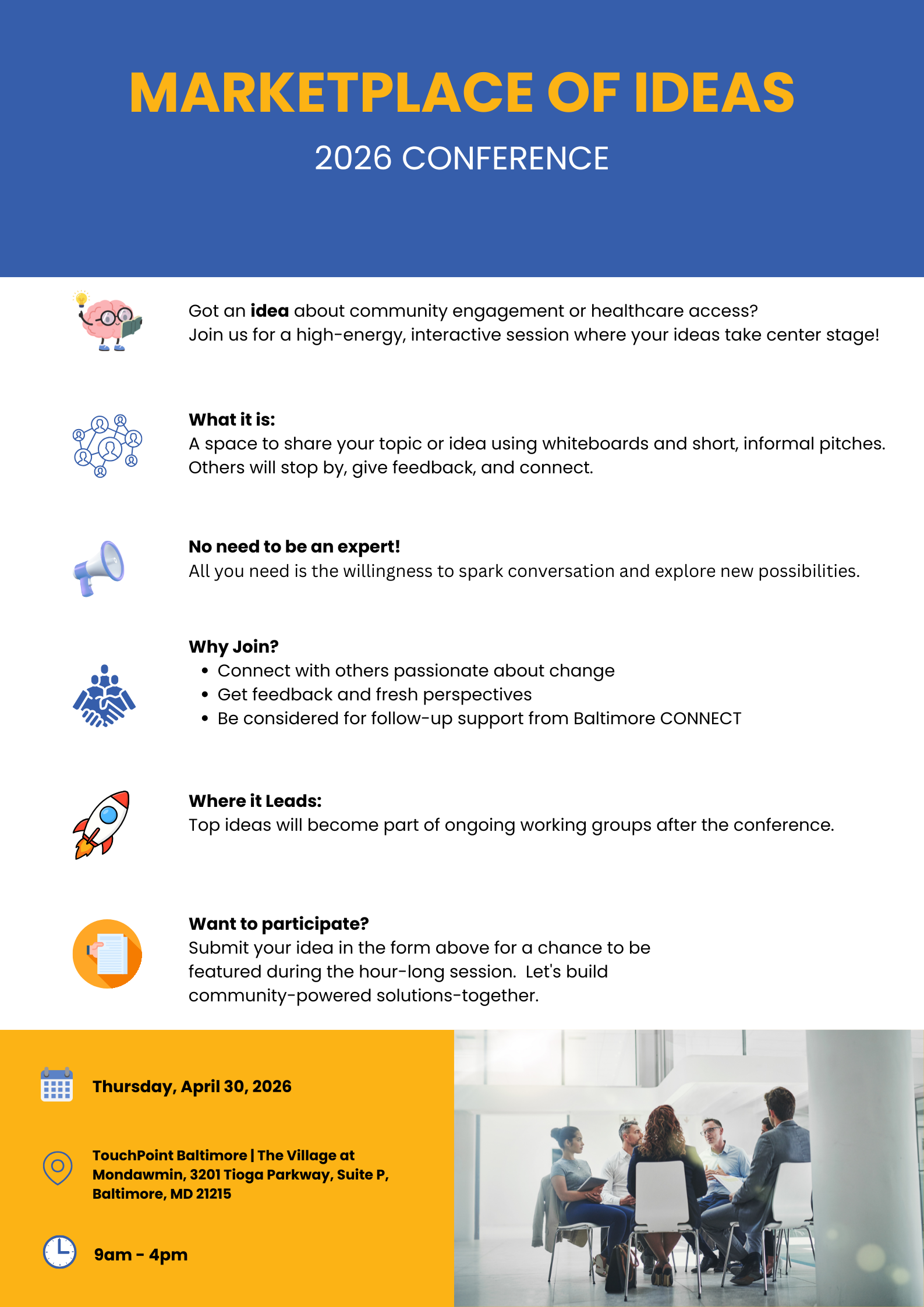 The Baltimore CONNECT Community Conference is an annual regional gathering designed to increase awareness of local community services and resources, strengthen connections across organizations, and expand access to care for underserved residents in Baltimore City. With more than 150 attendees last year—including nonprofits, community groups, faith-based organizations, healthcare systems, and city agencies—the conference fosters collaboration and uplifts community-informed solutions to social and healthcare challenges. The 2026 theme, Building Bridges, Breaking Barriers, emphasizes advancing equity by strengthening partnerships and removing obstacles to resources.