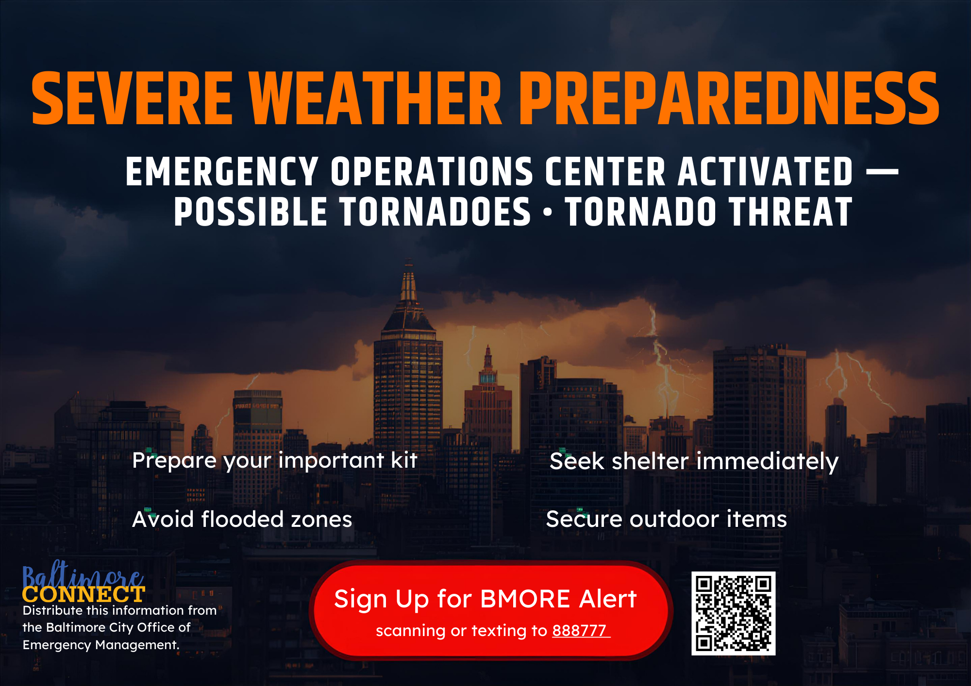 Baltimore CONNECT is sharing an important update from City officials regarding potential severe thunderstorms and tornado activity expected to impact the Baltimore region on Monday, March 16.