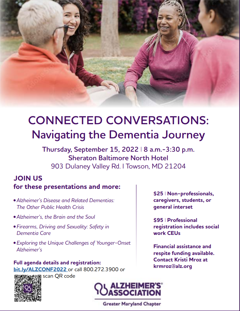 Join the Alzheimer’s Association for CONNECTED CONVERSATIONS: Navigating the Dementia Journey on Thursday, September 15, from 8am-3:30pm at the Sheraton Baltimore North Hotel (903 Dulaney Valley Rd, Towson, MD 21204)! They will be hosting presentations on Alzheimer’s Disease and Related Dementias, Safety in Dementia Care, Exploring the Unique Challenges of Younger-Onset Alzheimer’s, and more.