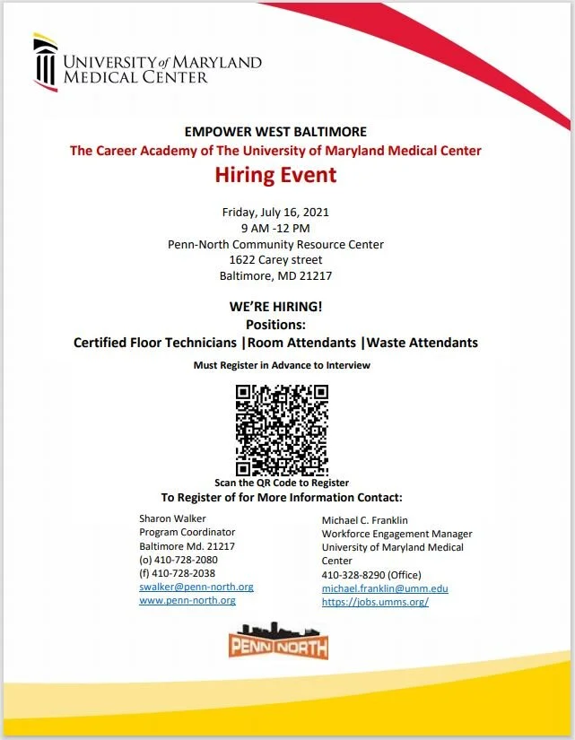 “The Career Academy of UMMC is sponsoring a hiring event for qualified job-seekers on Friday, July 16, 2021, at the Penn-North Resource Center. We invite you to register interested job-seekers for the upcoming hiring event as we endeavor to expose job-seekers to meaningful employment opportunities at UMMC. If you have questions, please don’t hesitate to contact me by email (Michael Franklin, michael.franklin@umm.edu) or Ms. Sharon Walker. Individuals that plan to attend must register and complete an online application in its entirety by Tuesday, July 13, 2021.”