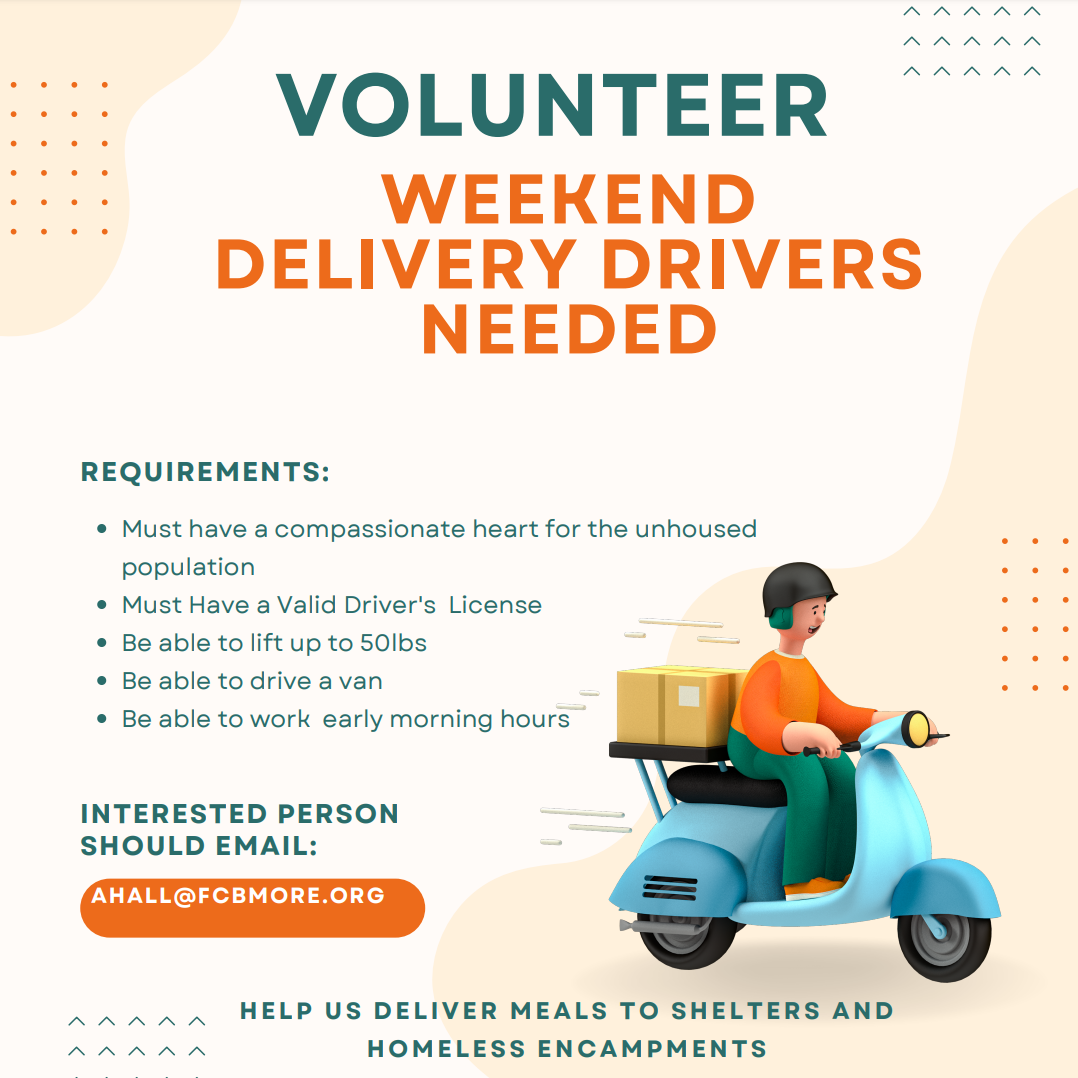 The Franciscan Center is seeking volunteers to help deliver meals on the weekends to shelters and homeless encampments! Interested persons should email Angela Hall at ahall@fcbmore.org.