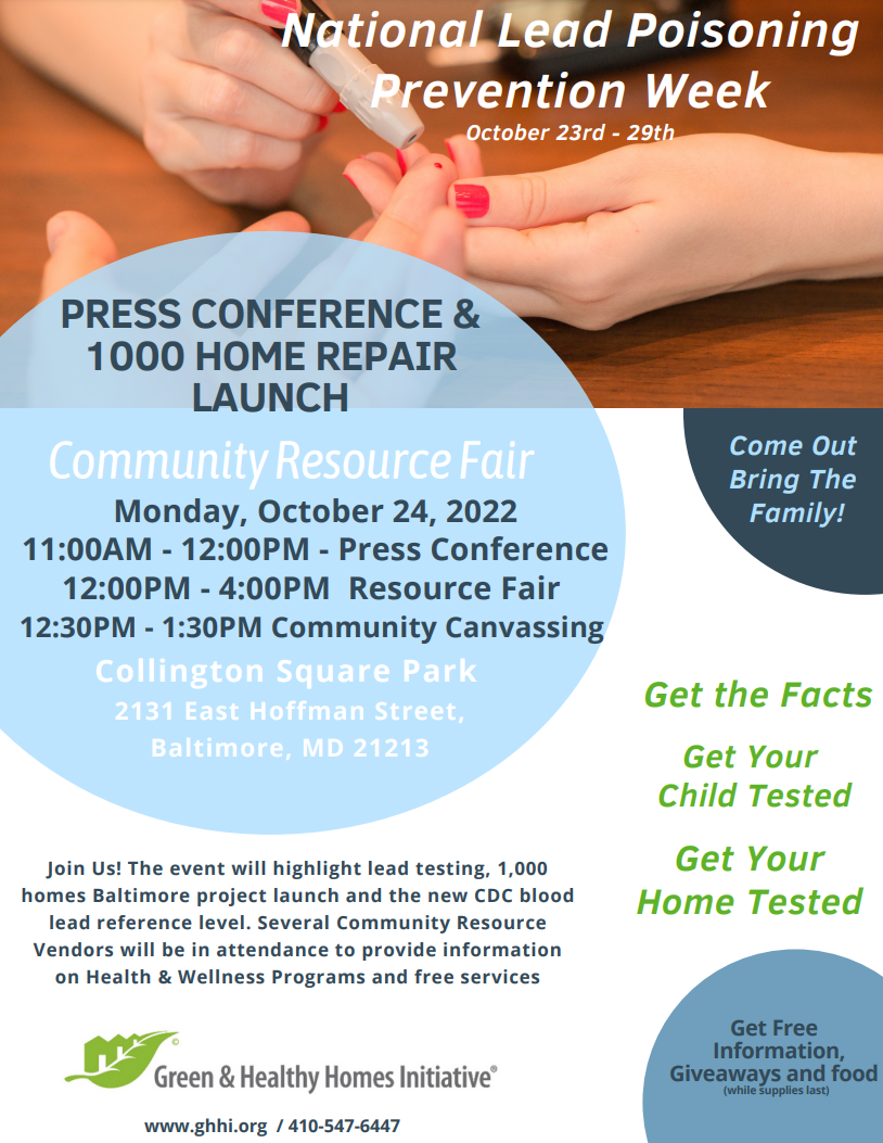 The event will highlight lead testing, 1,000 homes Baltimore project launch and the new CDC blood lead reference level. There will be an opportunity for community partners to share resources, music, food and Giveaways. Door to Door Canvassing Campaign following Press Conference Flyer Attached