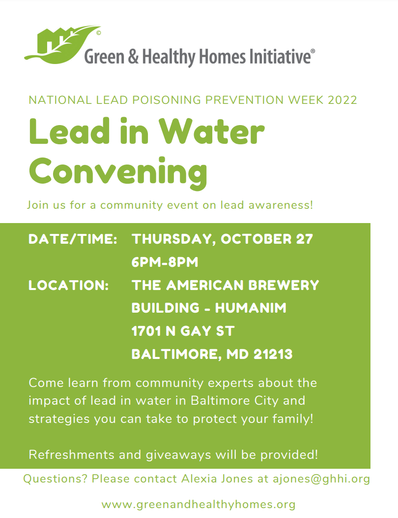 GHHI will host a Lead in Water Convening event to increase the awareness. There will be representative from MDH, MDE, EPA and Baltimore City school to conduct a panel discuss on Lead in Water. Addressing lead in drinking water as part of a comprehensive approach to lead poisoning prevention and health equity. You are invited to Join us. To RSVP your attendance email AJones@ghhi.org