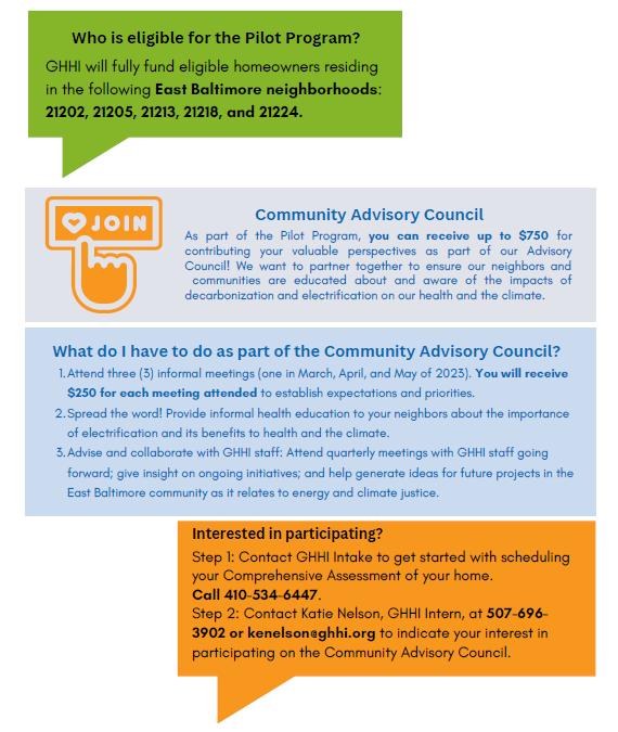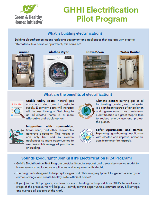 Green & Healthy Homes Initiative (GHHI) is recruiting qualified homeowners and renters for GHHI’s Electrification Pilot Program. The first meeting will be on Tuesday, March 21, 2023, from 4:30pm – 6:30pm, which will consist of learning the process involving replacing equipment and appliances in the home that rely on gas with electric alternatives (such as furnaces, stove/ovens, and water heaters). Electrification can have a significant impact on reducing energy use, improving our health, and protecting the planet.