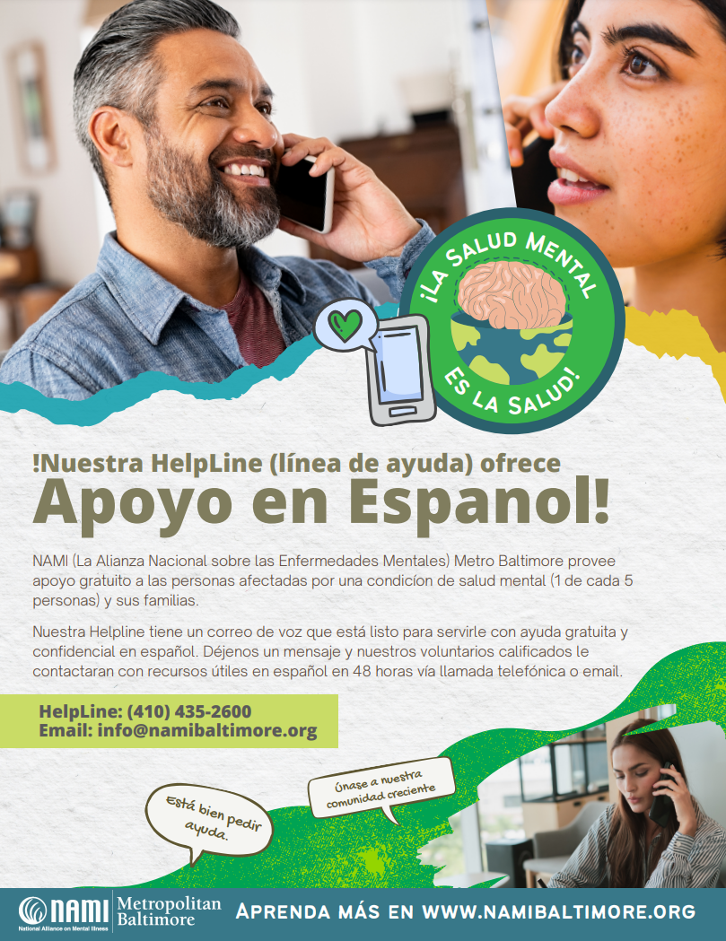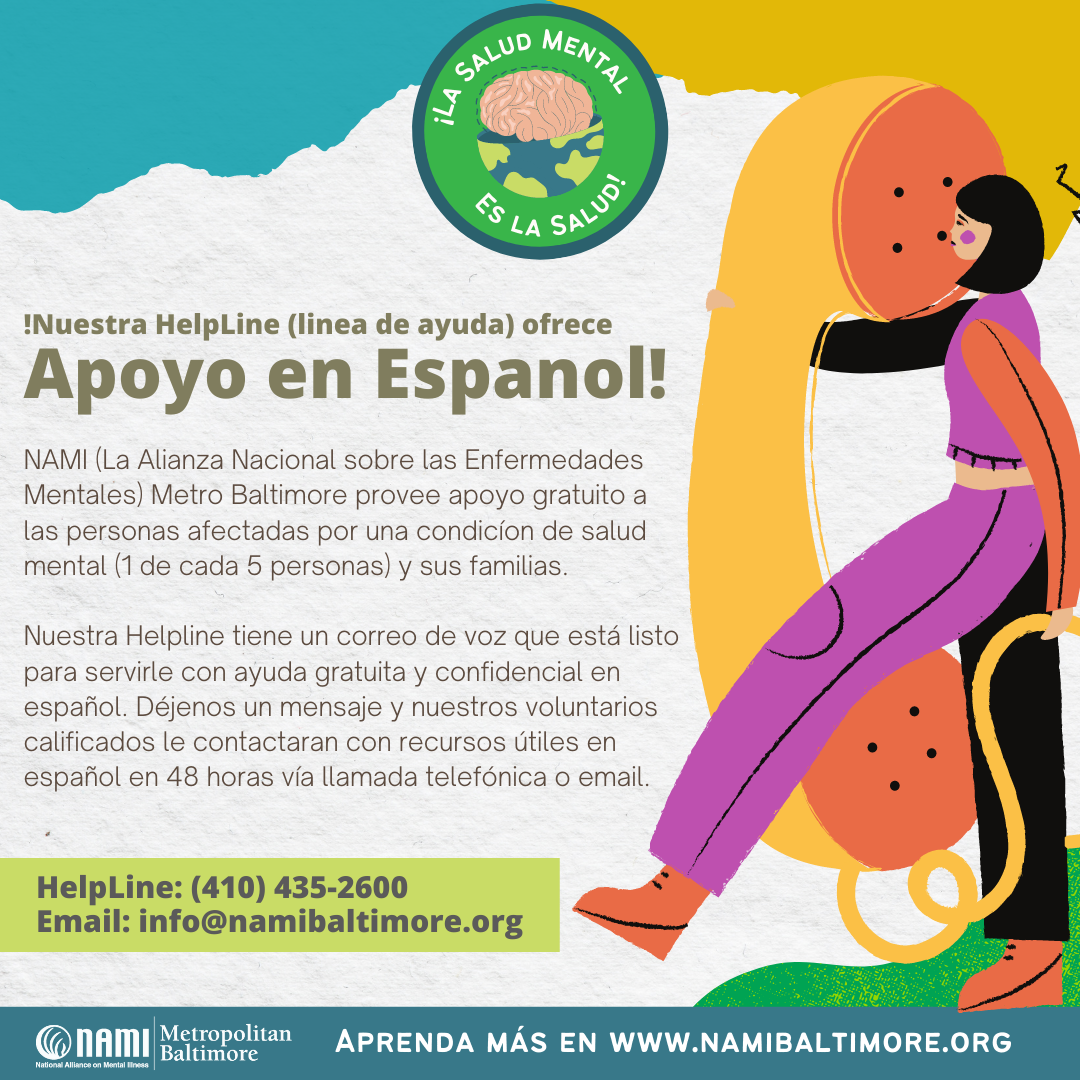 As they soft-launch this new feature of the helpline, callers will press 1 to indicate they’d like to speak to someone in Spanish and will be able to leave a voicemail and have their call returned within 48-hours of placing their call. Individuals are also welcome to email info@namibaltimore.org and expect a response in Spanish!